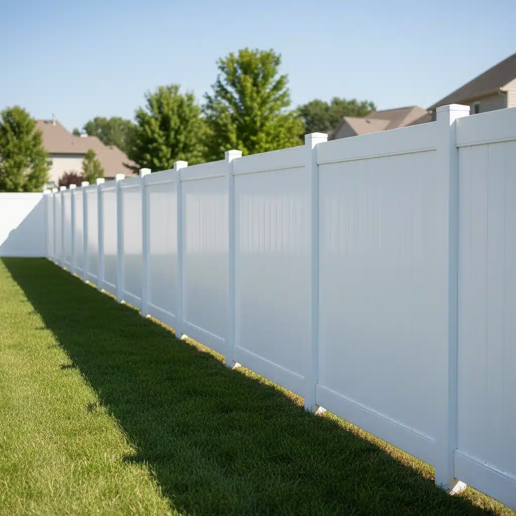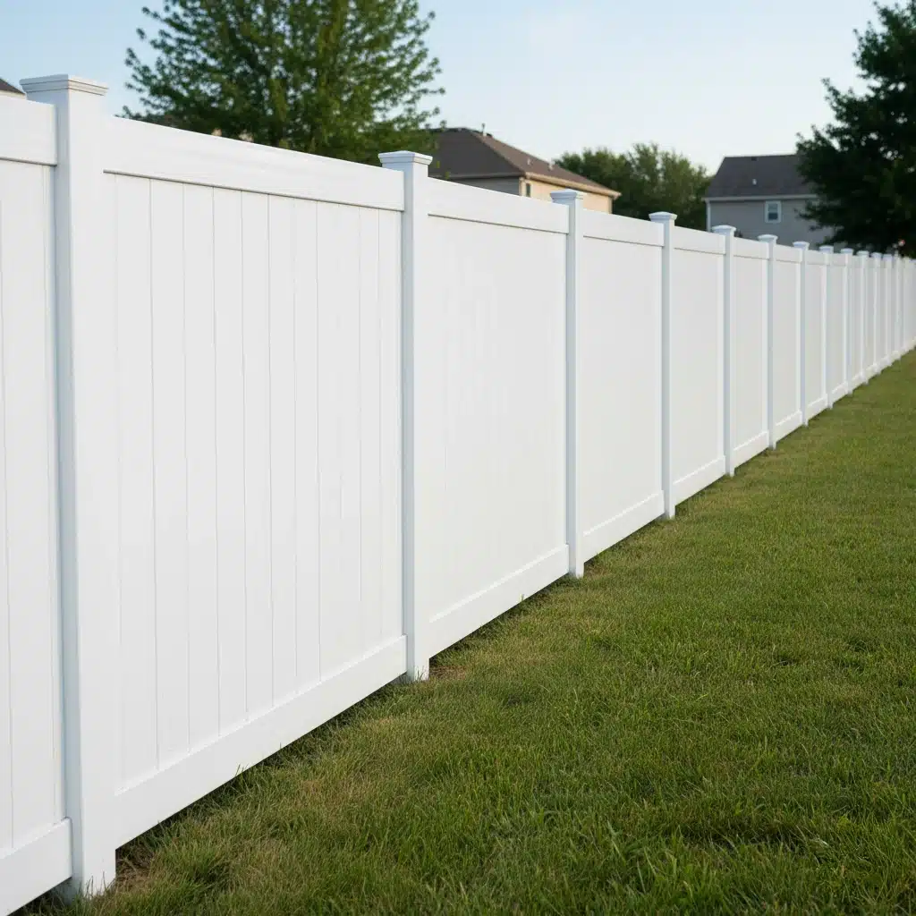 Wide view of a bright white vinyl privacy fence surrounding a clean suburban backyard with green grass and blue sky